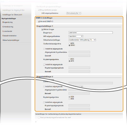 SNMP (Simple Network Management Protocol) er en protokol til overvågning og styring af kommunikationsenheder på et netværk ved hjælp af MIB (Management Information Base). Maskinen understøtter SNMPv1 og den sikkerhedsudvidede SNMPv3-udgave. Du kan kontrollere statussen på maskinen fra en computer, når du udskriver dokumenter eller bruger Brugerinterface til fjernbetjening. Du kan aktivere enten SNMPv1 eller SNMPv3 eller begge på samme tid. Angiv indstillingerne for hver version, så de passer til dit netværksmiljø og anvendelsens formål.