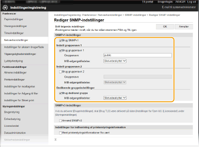 Hvis SNMPv1 er deaktiveret, vil nogle af maskinens funktioner ikke være tilgængelige, f.eks. hentning af maskinoplysninger via printerdriveren.