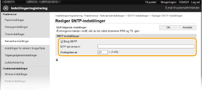 Test af kommunikation med NTP-/SNTP-serverenDu kan se kommunikationsstatus med den registrerede server ved at klikke på [Indstillinger/registrering]