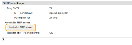 [Netværksindstillinger] [Kontrollér NTP-server] i [SNTP-indstillinger]. Hvis der er etableret en korrekt forbindelse, vises resultatet som vist herunder. Bemærk, at denne handling ikke justerer systemuret.![]() |
