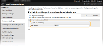 Marker afkrydsningsfeltet for at indstille maskinen til at reagere på pakker til registrering af software-multicasts til styring af enheder og aktivere overvågning ved hjælp af software til styring af enheder. ![]() Du kan ændre portnummeret for multicast-registrering ved at se Ændring af portnumre.