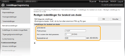 Marker afkrydsningsfeltet for at give software til styring af enheder besked om, om maskinen er tændt eller slukket. Når [Underret] er valgt, kan du forvente, at maskinen undgår unødvendig kommunikation i dvaletilstanden, så det samlede strømforbrug reduceres. [Portnummer]