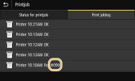 Hvis der opstår en fejl som f.eks., hvis en udskrivning ikke kan gennemføres, eller hvis du ikke kan modtage en I-fax, vises den tilsvarende fejlkode på joblogskærmen som et trecifret tal. Kontroller følgende for at få flere oplysninger om årsager og løsninger for hver fejlkode. Se