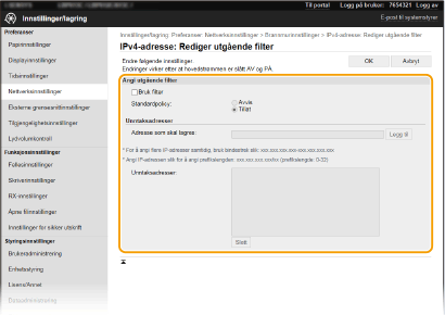 Hvis IP-adresser blir angitt feil, kan det hende at du ikke får tilgang til maskinen fra Fjernkontroll. I så fall må du angi <IPv4-adressefilter> eller <IPv6-adressefilter> til <Av>.