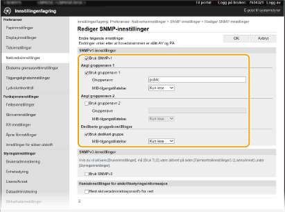 Hvis begge versjoner av SNMP er aktivert, anbefales det at MIB-tilgangstillatelsen i SNMPv1 angis til [Kun lese]. MIB-tilgangstillatelsen kan angis uavhengig i SNMPv1 og SNMPv3 (og for hver bruker i SNMPv3). Ved å velge [Lese/skrive] (full tilgangstillatelse) i SNMPv1 oppheves de robuste sikkerhetsfunksjonene som er et kjennetegn i SNMPv3, fordi de fleste av maskininnstillingene dermed kan kontrolleres med SNMPv1.