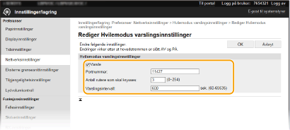 Merk av i boksen for å varsle enhetsbehandlingsprogramvaren om strømstatusen for maskinen. Når [Varsle] er valgt, kan du forvente at maskinen unngår unødvendig kommunikasjon under dvalemodus og reduserer det totale strømforbruket. [Portnummer]