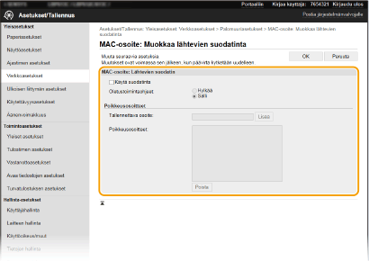Jos MAC-osoitteet on syötetty väärin, et ehkä pysty käyttämään laitetta etäkäyttöliittymästä, missä tapauksessa <MAC-osoitesuodatin>-asetukseksi täytyy valita <Ei>. <MAC-osoitesuodatin>