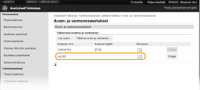 Avainta ja varmennetta ei voi poistaa, jos ne ovat käytössä, esimerkiksi kun "[TLS]" tai "[IEEE 802.1X]" näkyy kohdassa [Avaimen käyttö]. Poista tällöin toiminto käytöstä tai vaihda avain ja varmenne ennen poistamista.