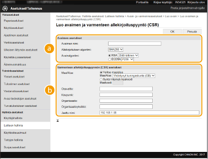 Koska laitteella luoduilla varmenteilla ei ole CA-allekirjoitusta, seurauksena voi olla tiedonsiirtovirhe laitteiden, joiden kanssa se siirtää tietoja, mukaan. Jotta varmenteen myöntäjä voisi myöntää CA-allekirjoituksen sisältävän varmenteen, sinun täytyy hankkia varmenteen allekirjoituspyynnön (CSR) tiedot, jotka pääkäyttäjä voi luoda Etäkäyttöliittymästä. Kun varmenne myönnetään, tallenna se avaimeen luodun CSR:n kanssa.