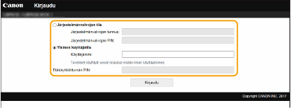 Voit käyttää kaikkia etäkäyttöliittymän toimintoja ja asetuksia. Syötä oikea tunnus kohtaan [Järjestelmänvalvojan tunnus] ja PIN-koodi kohtaan [Järjestelmänvalvojan PIN].