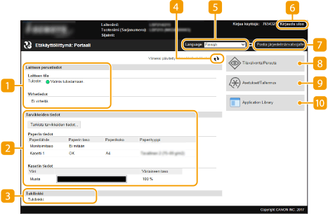 Näyttää paperin tiedot ja väriainekasettien jäljellä olevan väriaineen määrän.
