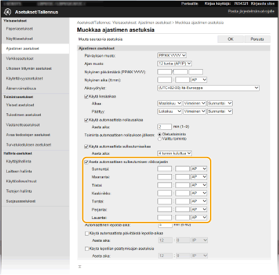 *Jos virtaa ei voi katkaista automaattisesti määritettynä aikana, sitä yritetään uudelleen enintään kymmenen kertaa yhden minuutin välein. Jos virtaa ei voi katkaista edes kymmenen uudelleenyrityksen jälkeen, automaattista sammutusta ei voi suorittaa kyseisenä päivänä.