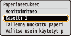 ![]() ![]() Jos usein käytettävä paperikoko tallennettiin painikkeisiin <S1>–<S3>, ne voidaan palauttaa yhdellä kosketuksella. Mukautetun paperikoon tallentaminen