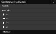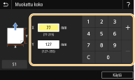 ![]() ![]() Jos usein käytettävä paperikoko tallennettiin painikkeisiin <S1>–<S3>, ne voidaan palauttaa yhdellä kosketuksella. Mukautetun paperikoon tallentaminen
