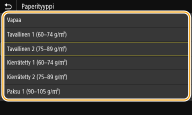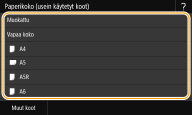 Jos yllä olevaa näyttöä ei näytetä, kun paperia lisätäänJos monikäyttöalustalle lisätään aina samaa paperia, voit ohittaa paperiasetustoiminnot tallentamalla paperikoon ja -tyypin oletusasetukseksi. Kun oletusasetus on tallennettu, yllä olevaa näyttöä ei näytetä. Voit tuoda näytön esiin valitsemalla <Määritä paperin lataaminen> (Monikäyttötason oletuspaperiasetusten tallentaminen).