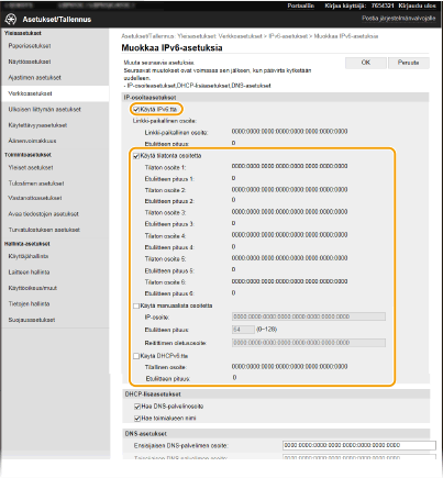 Laitteen IPv6-osoitteet voidaan määrittää etäkäyttöliittymän avulla. Tarkista IPv4-osoiteasetukset ennen IPv6-osoitteiden asettamista (IPv4-asetusten näyttäminen). Sinun on asetettava oikeat IPv4-asetukset, jotta voit käyttää IPv6-osoitteita. Laite voi käyttää seuraavia useita IPv6-osoitteita: