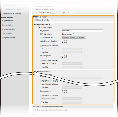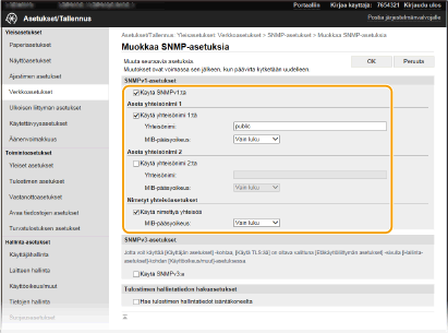 SNMP (Simple Network Management Protocol) on protokolla, jolla valvotaan ja ohjataan verkon tiedonsiirtolaitteita käyttämällä MIB:tä (Management Information Base). Laite tukee SNMPv1-protokollaa ja edistyneemmän suojauksen SNMPv3-protokollaa. Voit tarkistaa laitteen tilan tietokoneesta, kun tulostat asiakirjoja tai käytät Etäkäyttöliittymää. Voit ottaa käyttöön SNMPv1:n, SNMPv3:n tai molemmat samanaikaisesti. Määritä kunkin version asetukset verkkoympäristöön ja käyttötarkoitukseen sopiviksi.