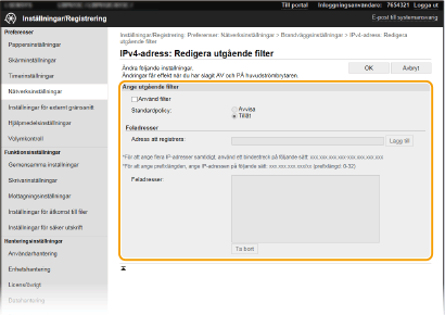 Om IP-adresser anges felaktigt kanske du inte kan använda enheten från Fjärranvändargränssnittet och då måste du ställa in <IPv4-adressfilter> eller <IPv6-adressfilter> på <Av>.