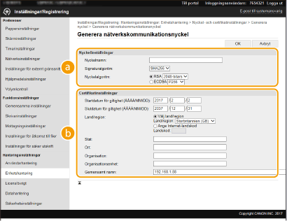 Välj nyckelgenereringsalgoritmen i [RSA] eller [ECDSA] och välj sedan nyckellängd i listrutan. Ju större tal för nyckellängden desto högre säkerhetsnivå. Dock blir kommunikationen långsammare.