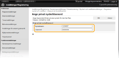[Lösenord] Använd alfanumeriska tecken och ange lösenordet för den privata nyckel som har angetts för filen som ska registreras.