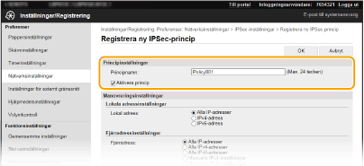 Använda kontrollpanelenDu kan också aktivera eller inaktivera IPSec-kommunikation från <Meny> på skärmen Hem. <Använd IPSec>