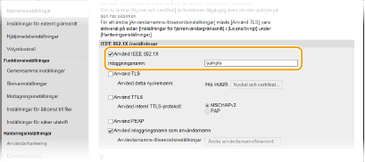 Använda kontrollpanelenDu kan också aktivera eller inaktivera IEEE 802.1X-autentisering från <Meny> på skärmen Hem. <Använd IEEE 802.1X>/<IEEE 802.1X-inställningar>