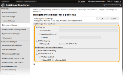 Detta ställer in intervallet (i minuter) som används för att automatiskt ansluta till POP3-servern. Om det finns I-fax-dokument på servern tas de automatiskt emot och skrivs ut.