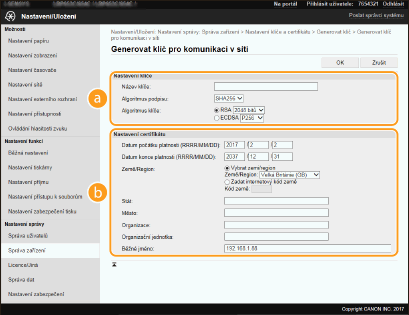 Vyberte možnost [Správa zařízení]  [Nastavení klíče a certifikátu].