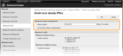 V textovém poli [Název zásad] zadejte formou alfanumerických znaků jméno, pomocí kterého bude možné zásadu identifikovat.