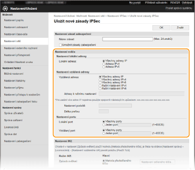 Vyberte sadu IPSec pro všechny IP pakety, které se odesílají do adresy IPv4 přístroje nebo z ní.