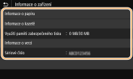 Zobrazí stav zařízení, např. množství papíru nebo zbývající množství toneru v kazetách.