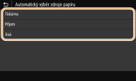 U každého zdroje papíru zapněte nebo vypněte funkci automatického výběru zdroje papíru. Je-li tato možnost nastavena na <Zap>, zařízení pro každou tiskovou úlohu automaticky vybírá zdroj papíru, v němž je vložen papír příslušné velikosti. Když ve vybraném zdroji papíru dojde papír, tato funkce umožňuje plynulý tisk přepínáním z daného zdroje papíru na jiný, v němž je vložen papír stejné velikosti.