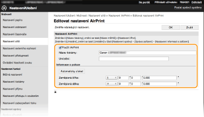 Umožňuje zkontrolovat hodnoty zadané v nastaveních služby AirPrint, například název umístění stroje. Pro změnu nastavení klikněte na možnost [Editovat].