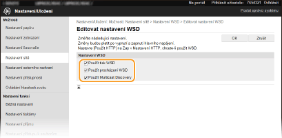 Políčko zaškrtněte, chcete-li získávat informace o zařízení z počítače pomocí protokolu WSD. Toto políčko se automaticky zaškrtne, je-li zaškrtnuto políčko [Použít tisk WSD]. [Použít Multicast Discovery]