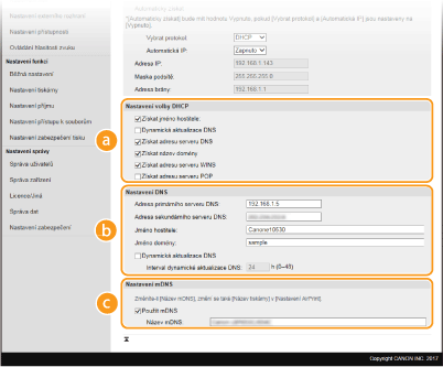 Toto políčko zaškrtněte, chcete-li dynamicky aktualizovat záznamy služby DNS při každé změně IP adresy zařízení. Interval mezi aktualizacemi lze zadat v hodinách do textového pole [Interval dynamické aktualizace DNS]. [Nastavení mDNS][Použít mDNS]