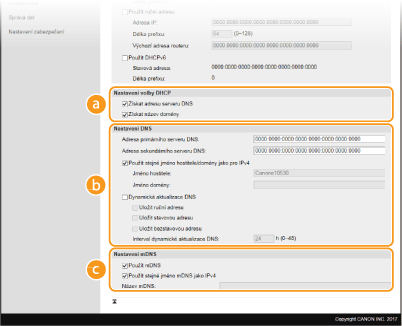 Toto políčko zaškrtněte, chcete-li dynamicky aktualizovat záznamy služby DNS při každé změně IP adresy zařízení. Pokud chcete zadat typ nebo typy adres, které chcete uložit na server DNS, zaškrtněte políčko pro [Uložit ruční adresu], [Uložit stavovou adresu] nebo [Uložit bezstavovou adresu]. Interval mezi aktualizacemi lze zadat v hodinách do textového pole [Interval dynamické aktualizace DNS]. [Nastavení mDNS][Použít mDNS]