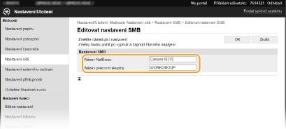 SMB (Server Message Block) představuje protokol ke sdílení zdrojů, například souborů a tiskáren, mezi několika zařízeními v síti. Budete ho potřebovat při konfiguraci zařízení jako sdílené tiskárny v síti SMB. Podle používané sítě může být nutné nastavit název systému NetBIOS a pracovní skupiny.