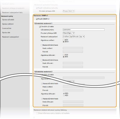 Při použití protokolu SNMPv3 můžete implementovat správu síťových zařízení chráněnou robustními funkcemi zabezpečení. Upozorňujeme, že před konfigurací protokolu SNMPv3 musí být aktivována funkce TLS Vzdáleného uživatelského rozhraní (
