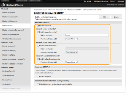 SNMP (Simple Network Management Protocol) je protokol určený k monitorování a ovládání komunikačních zařízení v síti pomocí funkce MIB (Management Information Base). Zařízení podporuje protokol SNMPv1 a protokol SNMPv3 s vylepšenými funkcemi zabezpečení. Stav zařízení lze zkontrolovat z počítače při tisku dokumentů nebo pomocí Vzdáleného uživatelského rozhraní. Můžete povolit buď protokol SNMPv1, nebo SNMPv3, případně oba současně. U každé verze zadejte nastavení odpovídající síťovému prostředí a účelům používání.