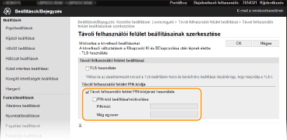 ![]() A kezelőpanel használatávalA Távoli felhasználói felület eléréséhez szükséges PIN-kódot a <Menü> felületén, a Főképernyő használatával is beállíthatja. <Távoli felhasználói felület beállításai>