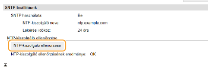 Az NTP/SNTP-kiszolgálóval folytatott kommunikáció teszteléseA bejegyzett kiszolgálóval folytatott kommunikáció állapotának megtekintéséhez kattintson a [Beállítások/Bejegyzés]
