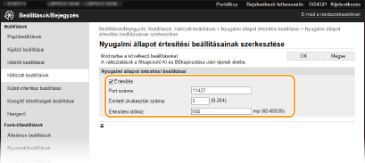 A jelölőnégyzet bejelölésével értesíthet egy eszközfelügyeleti szoftvert a készülék üzemállapotáról. Ha az [Értesítés] jelölőnégyzet be van jelölve, akkor a készülék alvó üzemmódban várhatóan elkerüli a felesleges kommunikációt, és csökkenti a teljes energiafogyasztást. [Port száma]