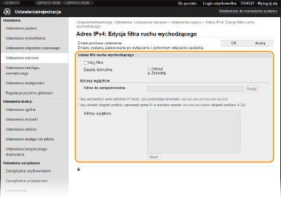 Nieprawidłowo wprowadzone adresy IP mogą uniemożliwić dostęp do urządzenia z poziomu Zdalnego interfejsu użytkownika. Konieczne będzie wtedy ustawienie filtra <Filtr adresów IPv4> albo <Filtr adresów IPv6> na <Wyłącz>.