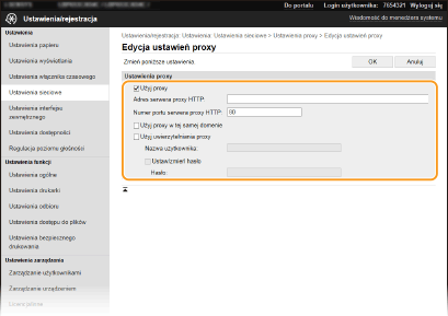 Aby włączyć funkcję uwierzytelnienia przez serwer proxy, zaznacz to pole wyboru i wprowadź nazwę użytkownika składającą się ze znaków alfanumerycznych w polu tekstowym [Nazwa użytkownika].