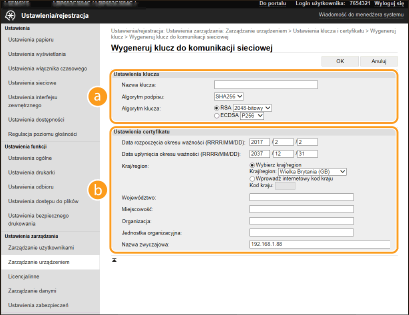 Klucz i certyfikat można wygenerować za pomocą urządzenia, jeśli wymaga tego komunikacja szyfrowana z użyciem protokołu Transport Layer Security (TLS). Z szyfrowania TLS można korzystać podczas udzielania dostępu do urządzenia przez Zdalny interfejs użytkownika. Wraz z kluczem i certyfikatem wygenerowanymi w menu „Komunikacja sieciowa” używane są certyfikaty z podpisem własnym.