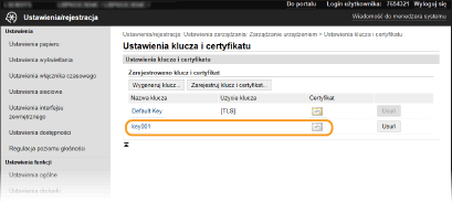 Nie można usunąć klucza i certyfikatu, które są obecnie używane do innych celów, np. gdy element „[TLS]” albo „[IEEE 802.1X]” jest wyświetlany w pozycji [Użycie klucza]. W takiej sytuacji należy wyłączyć daną funkcję albo zamienić klucz i certyfikat przed ich usunięciem.