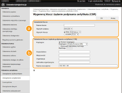 Z uwagi na to, że certyfikaty wygenerowane za pomocą urządzenia nie mają podpisu CA, w zależności od innych urządzeń, z którymi urządzenie się komunikuje, może wystąpić błąd komunikacji. Aby móc wykorzystać certyfikat z podpisem CA wydany przez urząd certyfikacji, należy posiadać dane CSR (żądanie podpisania certyfikatu), które administrator może wygenerować za pomocą Zdalnego interfejsu użytkownika. Po wydaniu certyfikatu należy zarejestrować go w ramach klucza z wygenerowanymi danymi CSR.