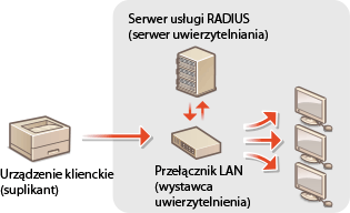 Urządzenie można podłączyć do sieci 802.1X jako urządzenie klienckie. Standardowa sieć 802.1X składa się z serwera RADIUS (serwera uwierzytelniania), przełącznika sieci LAN (wystawcy uwierzytelnienia) oraz urządzeń klienckich z oprogramowaniem uwierzytelniającym (suplikantów). Każde urządzenie, które próbuje nawiązać połączenie z siecią 802.1X, zostaje poddane procesowi uwierzytelnienia, aby potwierdzić uprawnienia użytkownika. Informacje uwierzytelniające są wysyłane na serwer RADIUS i tam sprawdzane. Serwer zezwala na nawiązanie komunikacji lub odrzuca próbę w zależności od wyniku procesu uwierzytelniania. Jeśli uwierzytelnianie zostanie zakończone niepowodzeniem, przełącznik sieci LAN (lub punkt dostępowy) blokuje dostęp spoza sieci.