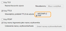 Zaznacz pole wyboru [Użyj TTLS] albo [Użyj PEAP].