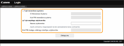Pozwala wykonywać wszystkie operacje i konfigurować wszystkie ustawienia w Zdalnym interfejsie użytkownika. Wprowadź poprawny identyfikator w polu [ID Menedżera Systemu] oraz PIN w polu [Kod PIN menedżera systemu].
